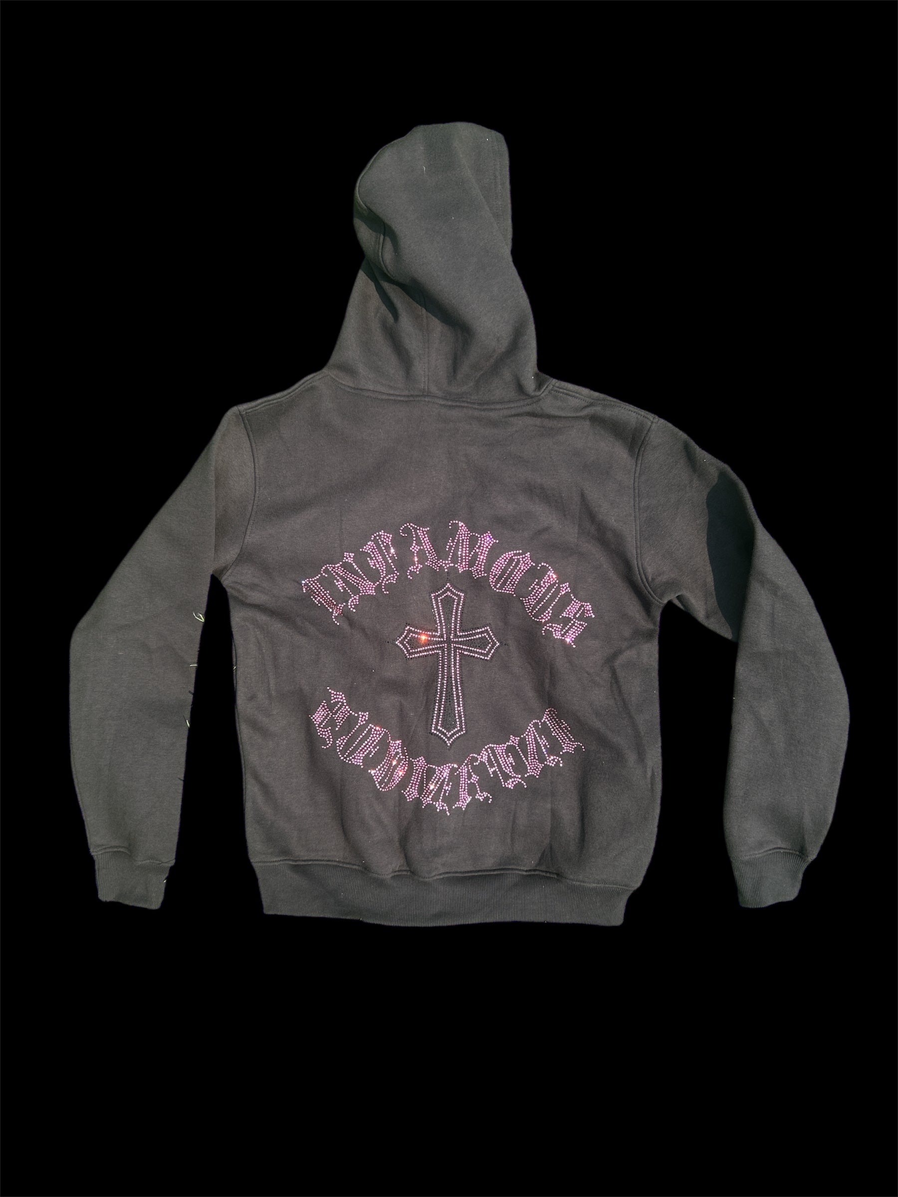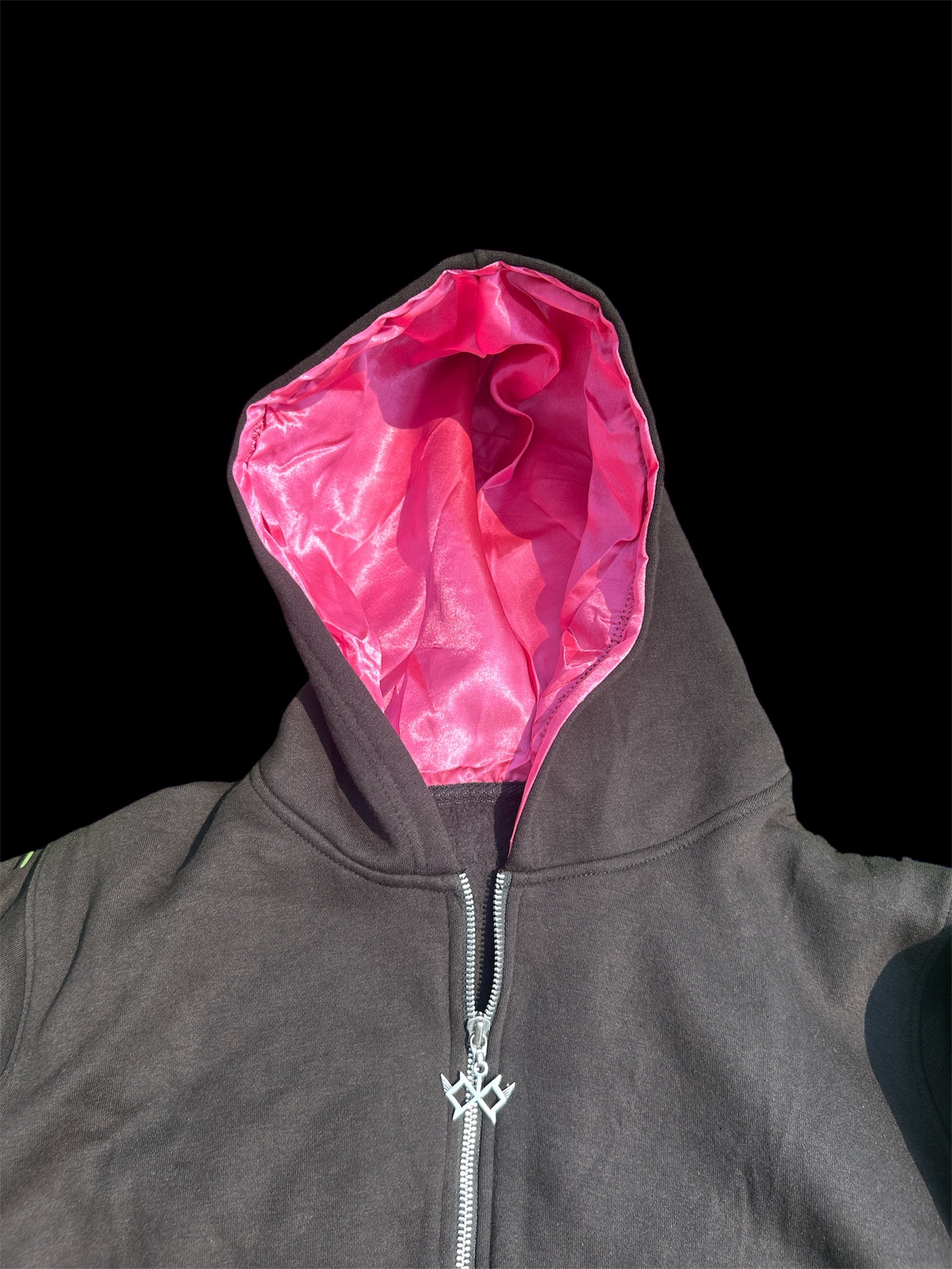 Our first product, featuring rhinestones on the back, a custom zipper with our logo on it, and a silk interior in the hood to protect your hair.